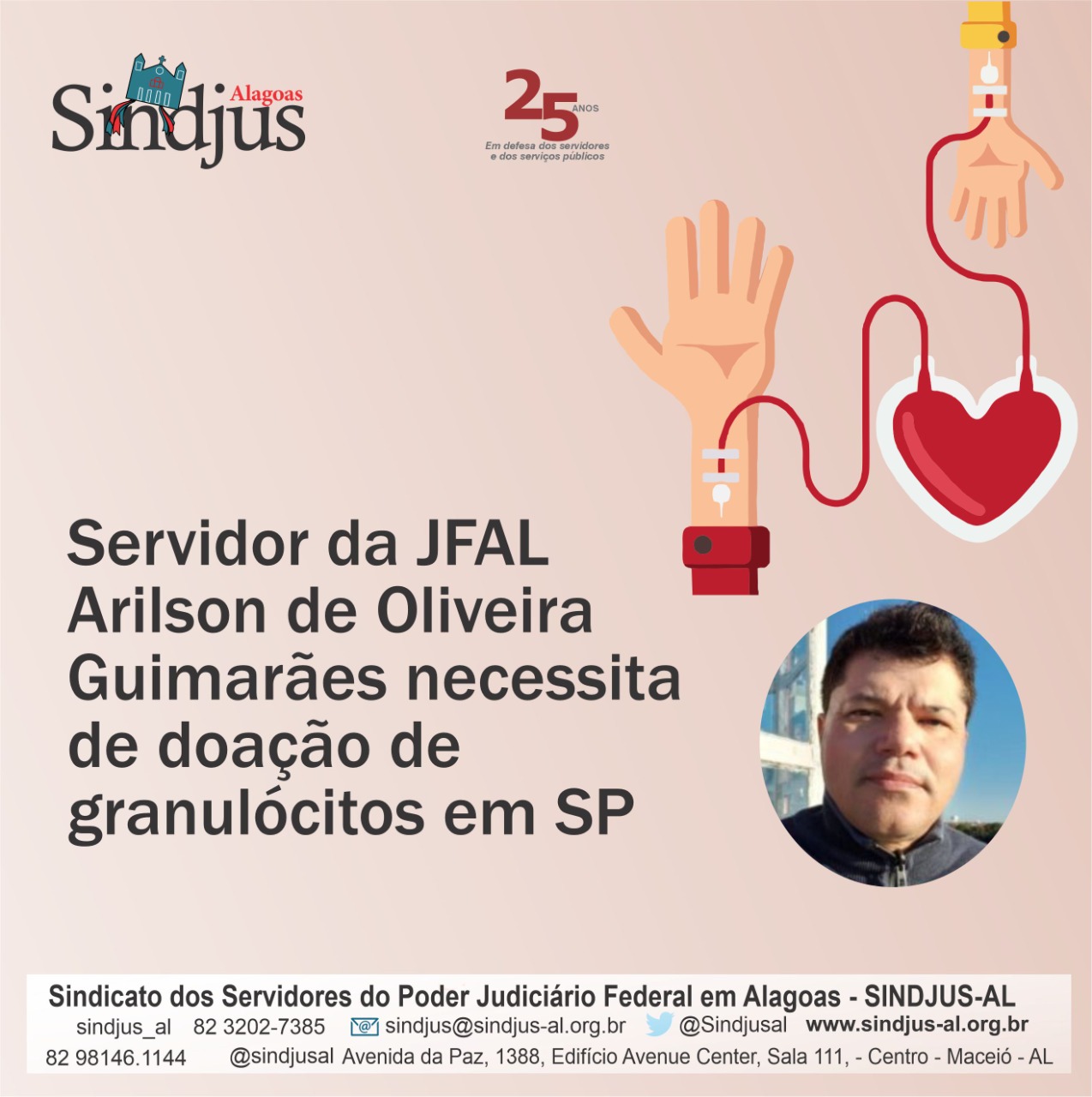 A família do Oficial de Justiça Federal de Alagoas Arilson de Oliveira Guimarães, solicita a doação de granulócitos com tipo de sangue B+ ou O aos moradores de São Paulo e região metropolitana.