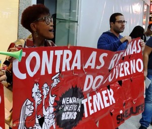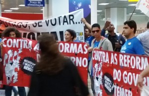 Deputados que embarcavam com destino à Brasília na terça-feira, dia 6, no Aeroporto Santos Dumont, foram recepcionados por manifestantes em protesto contra a aprovação da Reforma Previdenciária proposta por Michel Temer. O ato foi organizado pela Frente Rio Contra a Reforma da Previdência, que abriga diversas entidades sindicais como o Sisejufe, o Sindjustiça, o Sindifisco entre outras.