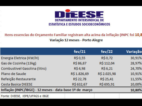 Segundo o Dieese, a inflação dos últimos 12 meses em Porto Alegre chega a 10,8%, puxada pela alta nos valores de energia elétrica, gás de cozinha, de plano de saúde, refeições fora de casa e cesta básica.
