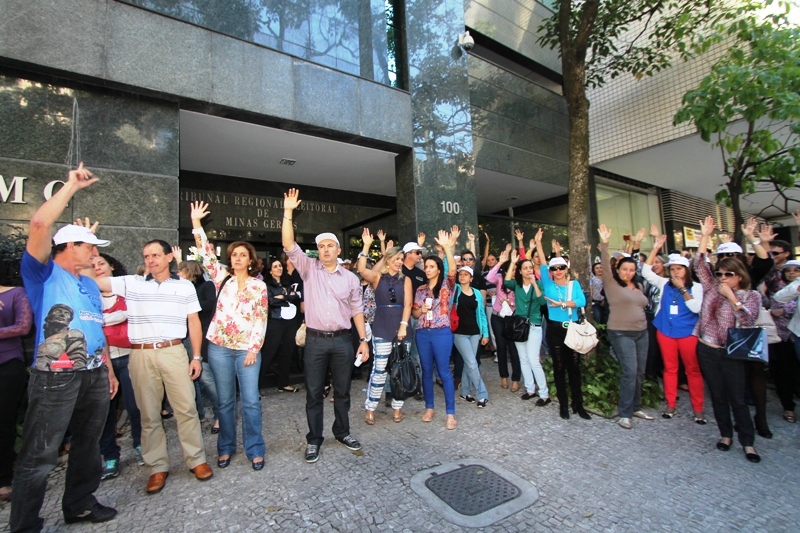 Em ato público e assembleia realizados na tarde desta terça-feira, 9, em frente ao prédio do TRE-MG, em Belo Horizonte, a maioria dos cerca de 300 servidores presentes votaram pela continuidade da greve em Minas e pela realização de atos públicos diários na capital, além de “arrastões” para chamar os colegas para a mobilização. Também ficou acertada a realização de novo ato público amanhã, dia 10, das 12h às 14h, em frente ao prédio do TRT na rua Mato Grosso, 468, no Barro Preto, em Belo Horizonte. No ato de hoje também não faltaram apitaços, palmas aos grevistas do estado e do país, palavras de ordem e o caixão do “enterro” da presidente Dilma Rousseff, que atraiu muitos curiosos.
