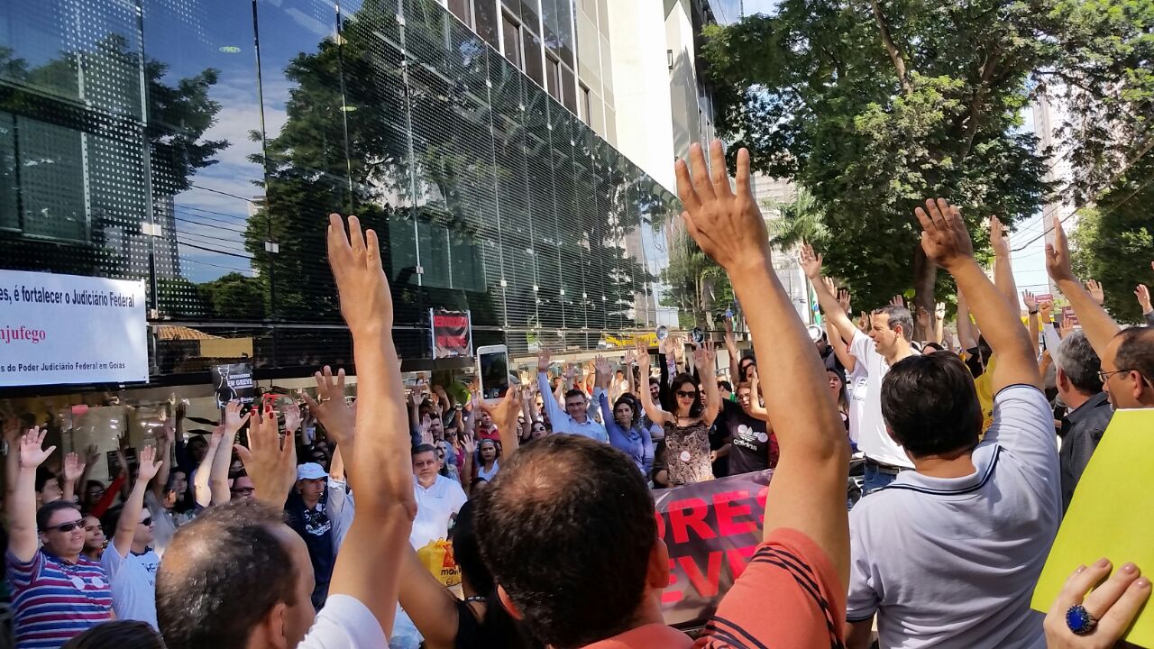 Reunidos em Assembleia Geral Extraordinária na manhã de hoje (26/06), na entrada do Fórum Trabalhista, os servidores grevistas de Goiás do TRT, TRE e JF, rejeitam, por unanimidade, proposta do Governo de 21,3% parcelados em 4 anos e a categoria assumiu sim o compromisso de intensificar cada vez mais a greve, bem como de invadir Brasília/DF no dia 30/06 (terça-feira).