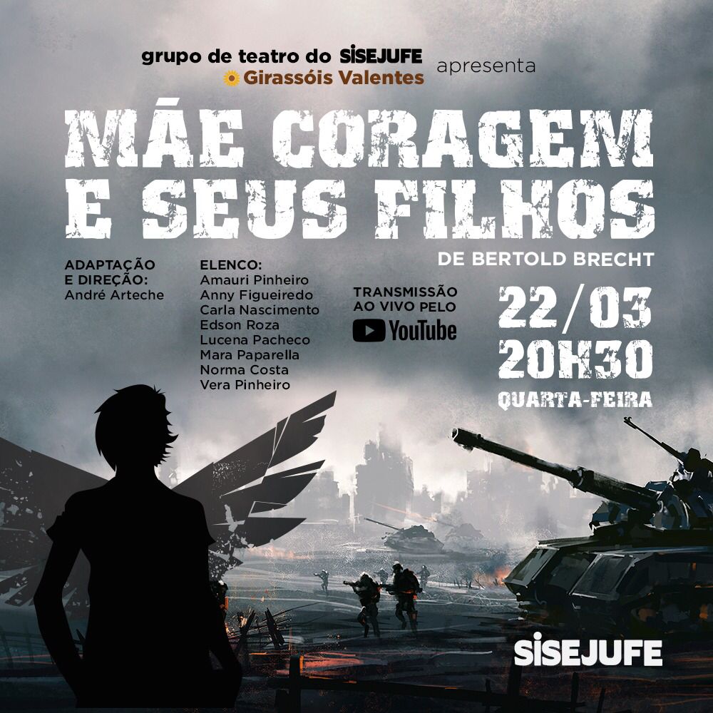 O elenco de teatro do Sisejufe Girassóis Valentes convida a todos e todas para assistir o espetáculo “Mãe coragem e seus filhos”, no dia 22 de março (quarta-feira), ao vivo pelo YouTube. A direção é do professor Andre Arteche. Já anote na agenda! Para acompanhar a apresentação, é só acessar o link: https://sisejufe.org.br/teatroaovivo