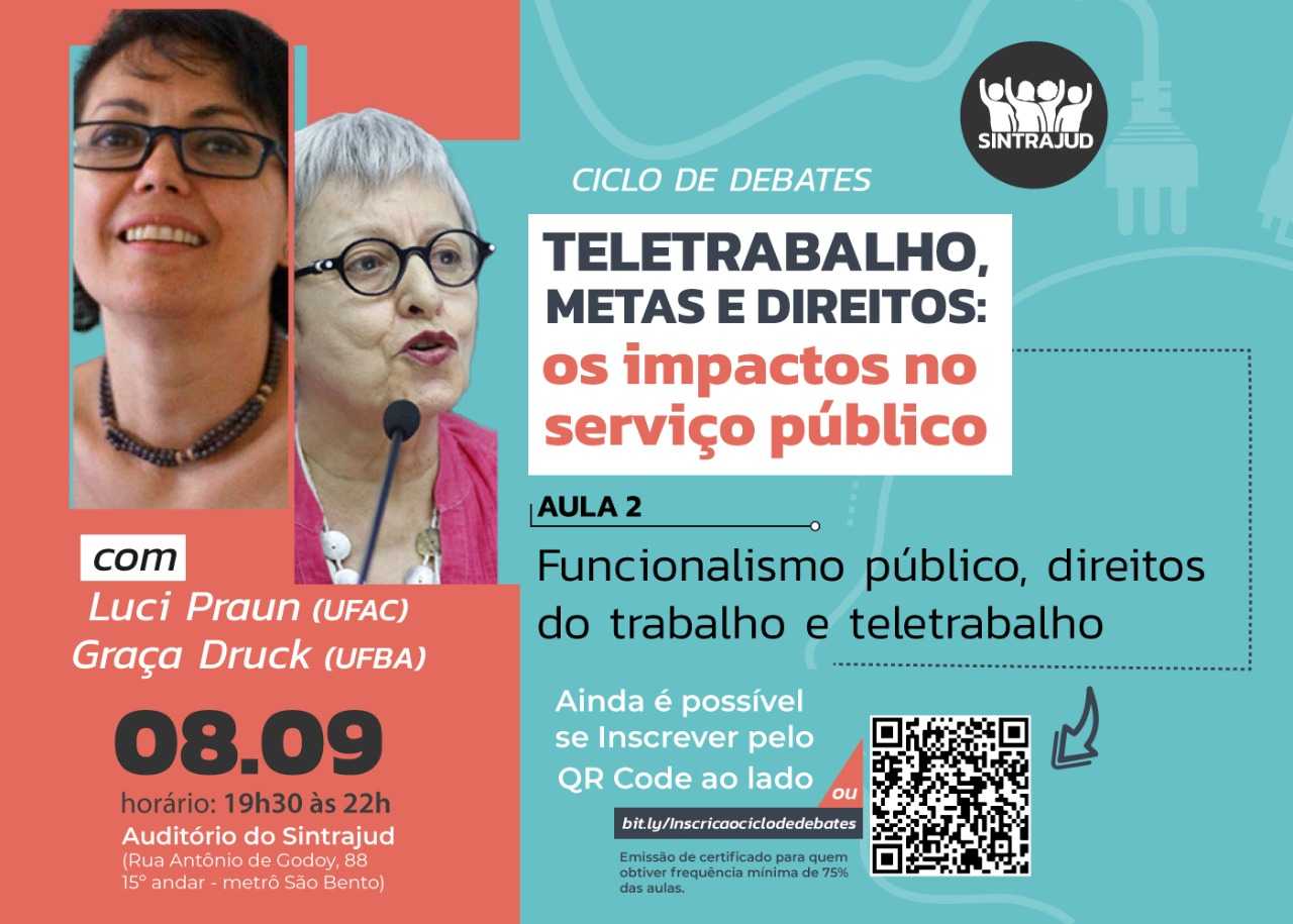 A mesa Funcionalismo público, Reforma Administrativa e perda de direitos do trabalho no Brasil/Programa de Gestão e Desempenho (PGD) e Teletrabalho no Serviço Público Federal contará com a participação da professora Luci Praun, da Universidade Federal do Acre e pesquisadora do da Grupo Mundo do Trabalho e suas Metamorfoses, na Unicamp. E também de Graça Druck, docente da Universidade Federal da Bahia, pesquisadora do Centro de Estudos e Pesquisas em Humanidades/CRH/UFBa e autora do livro Terceirização: desfordizando a fábrica (Boitempo Editorial e Edufba).
