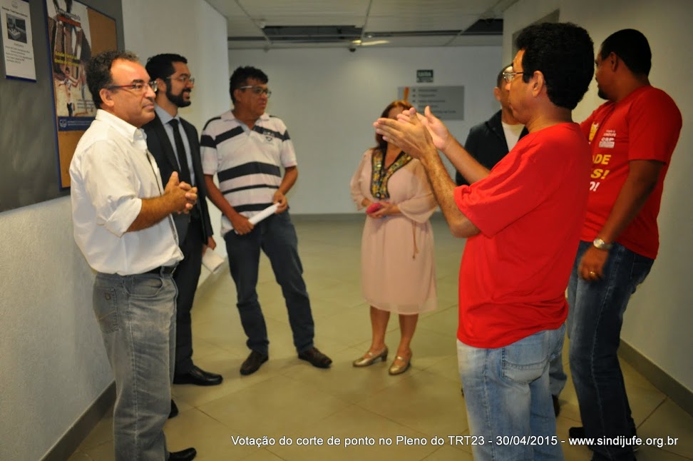 Na véspera do Dia do Trabalhador, o Sindijufe-MT e os Servidores do Judiciário Federal de Mato Grosso estão comemorando a vitória em uma das maiores lutas de todos os tempos,  envolvendo o direito de greve dos trabalhadores.  O corte de ponto imposto pelo presidente do TRT23, Edson Bueno, aos Servidores que aderiram, legalmente, à Greve da Categoria em agosto do ano passado, foi desfeito , na manhã de hoje (30), pelo Pleno do Tribunal. Foi acatado o pedido do Sindijufe-MT, por meio de um mandado de segurança, para que o ato administrativo fosse anulado.