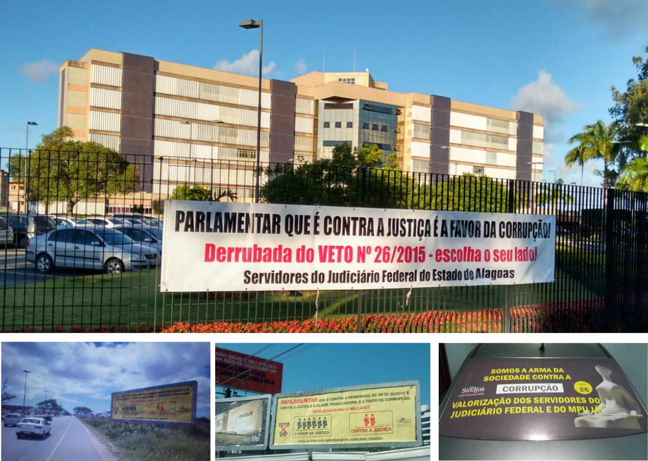 A categoria também mantém o trabalho de contato com os parlamentares alagoanos solicitando o seu apoio pela derrubada do veto 26. Os servidores espalharam outdoors, adesivos em carros e faixas pela cidade para clamar por justiça aos trabalhadores do Judiciário Federal que estão com salários desfasados há nove anos.