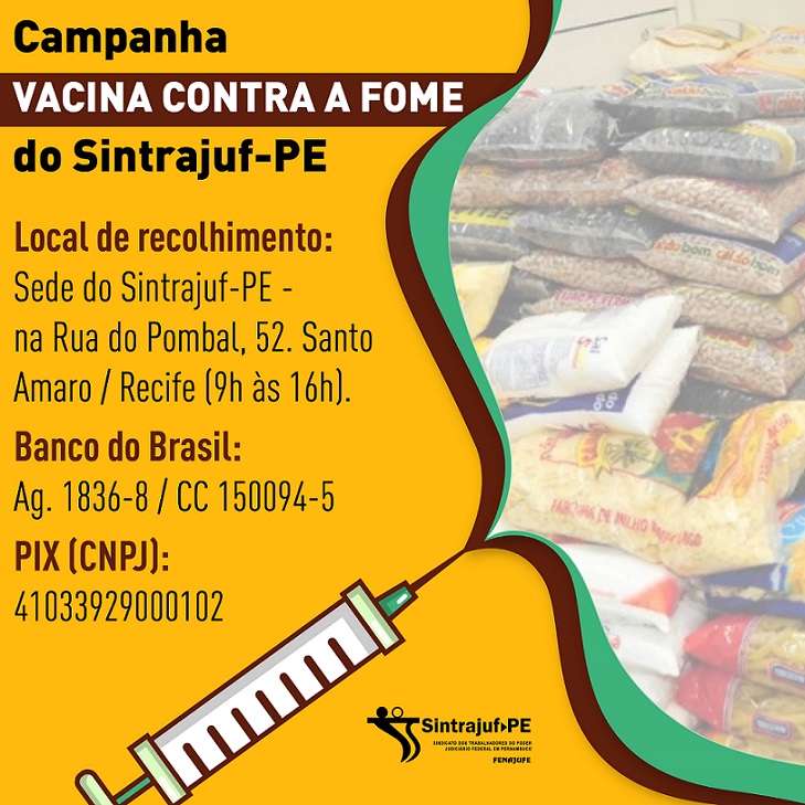 O Sindicato dos Trabalhadores do Poder Judiciário da União em Pernambuco (Sintrajuf-PE) lança, nesta quinta-feira (22), a campanha “Vacina contra a fome” que pretende arrecadar e doar alimentos para pessoas em situação de vulnerabilidade.