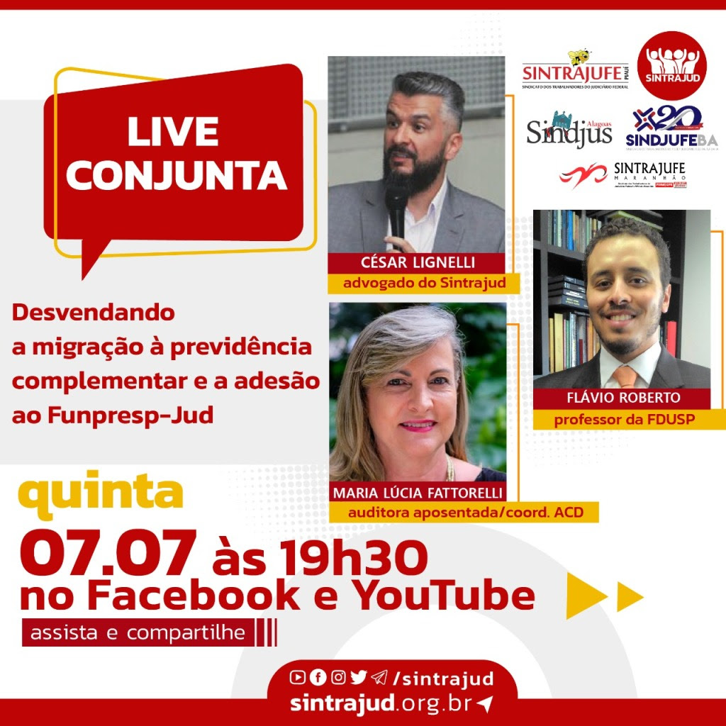 Sintrajud São Paulo, Sintrajufe Maranhão, Sintrajufe Piauí, Sindjus Alagoas e Sindjuf Bahia realizam às 19h30 do dia 7 de julho, quinta-feira, a live “Desvendando a migração à previdência complementar e a adesão ao Funpresp-Jud”, através da qual os servidores e servidoras poderão esclarecer o tema antes de decidirem pela adesão ao Funpresp-Jud, para o qual…