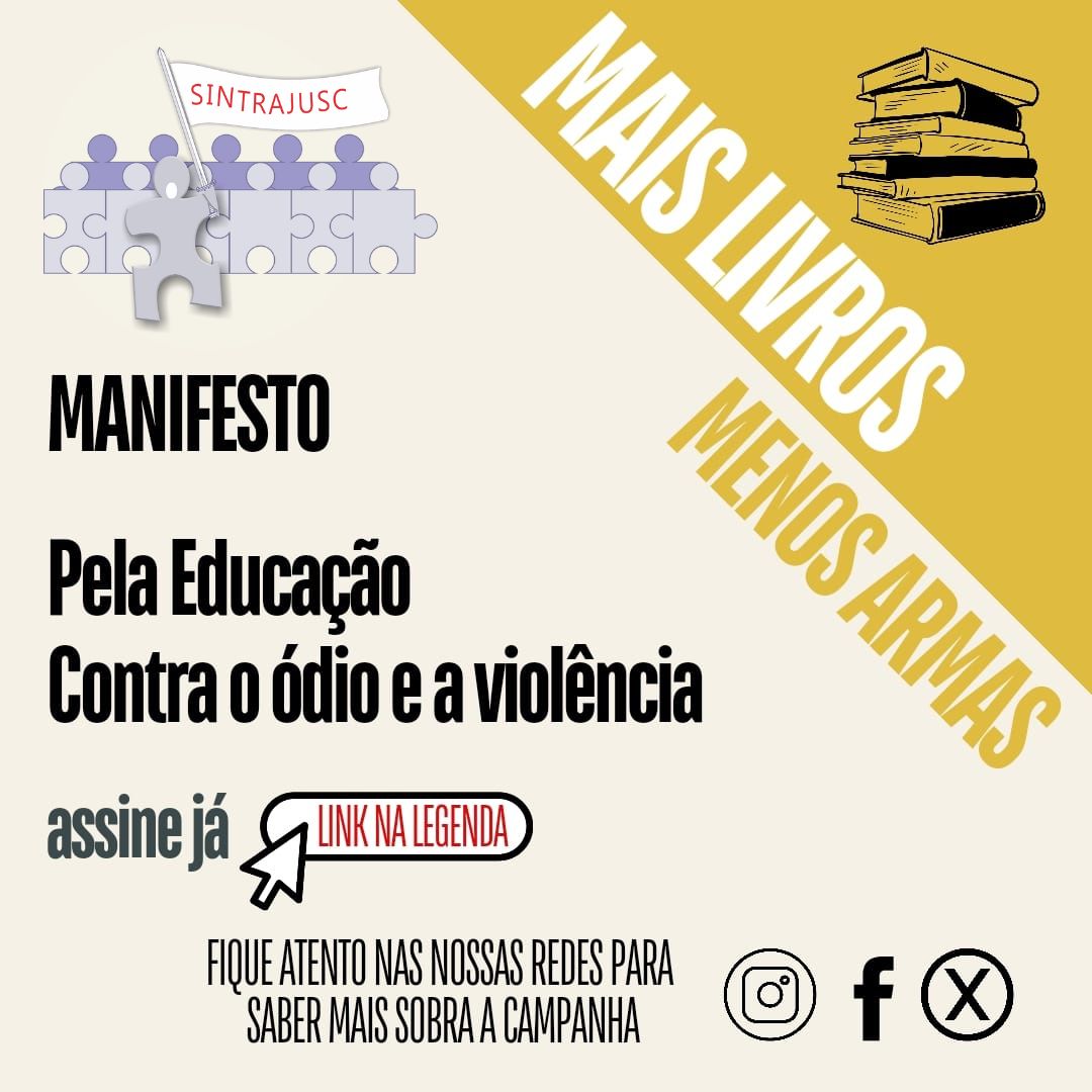 O Sintrajusc está apoiando a campanha “Mais livros menos armas”, do Movimento HumanizaSC, acompanhado de dezenas de entidades da área da educação e sindical, além de pessoas que compartilham dos mesmos ideais. O movimento lançou o Manifesto pela Educação e pela Paz, que pode ser lido e assinado digitalmente no link https://bit.ly/3UCoq49 O trecho final do…
