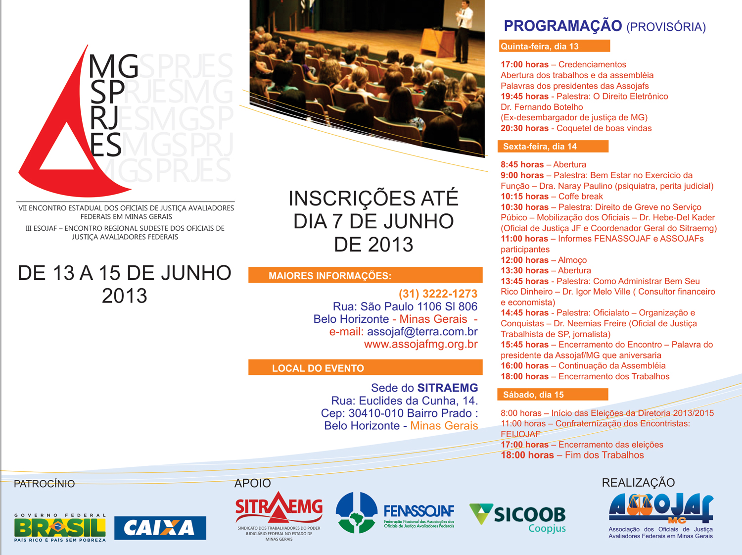 Entre os dias 13 e 15 de junho os oficiais de justiça do Poder Judiciário Federal em Minas Gerais e na Região Sudeste têm um encontro marcado no Sitraemg, que, além de anfitrião, é também apoiador dos encontros. Trata-se da realização do VII Encontro Estadual dos OJAF/MG e do III ESOJAF – Encontro Regional Sudeste dos Oficiais de Justiça Avaliadores Federais. Na ocasião, os oficiais de justiça mineiros também elegerão a nova diretoria da Assojaf-MG para o biênio 2013/2015.
