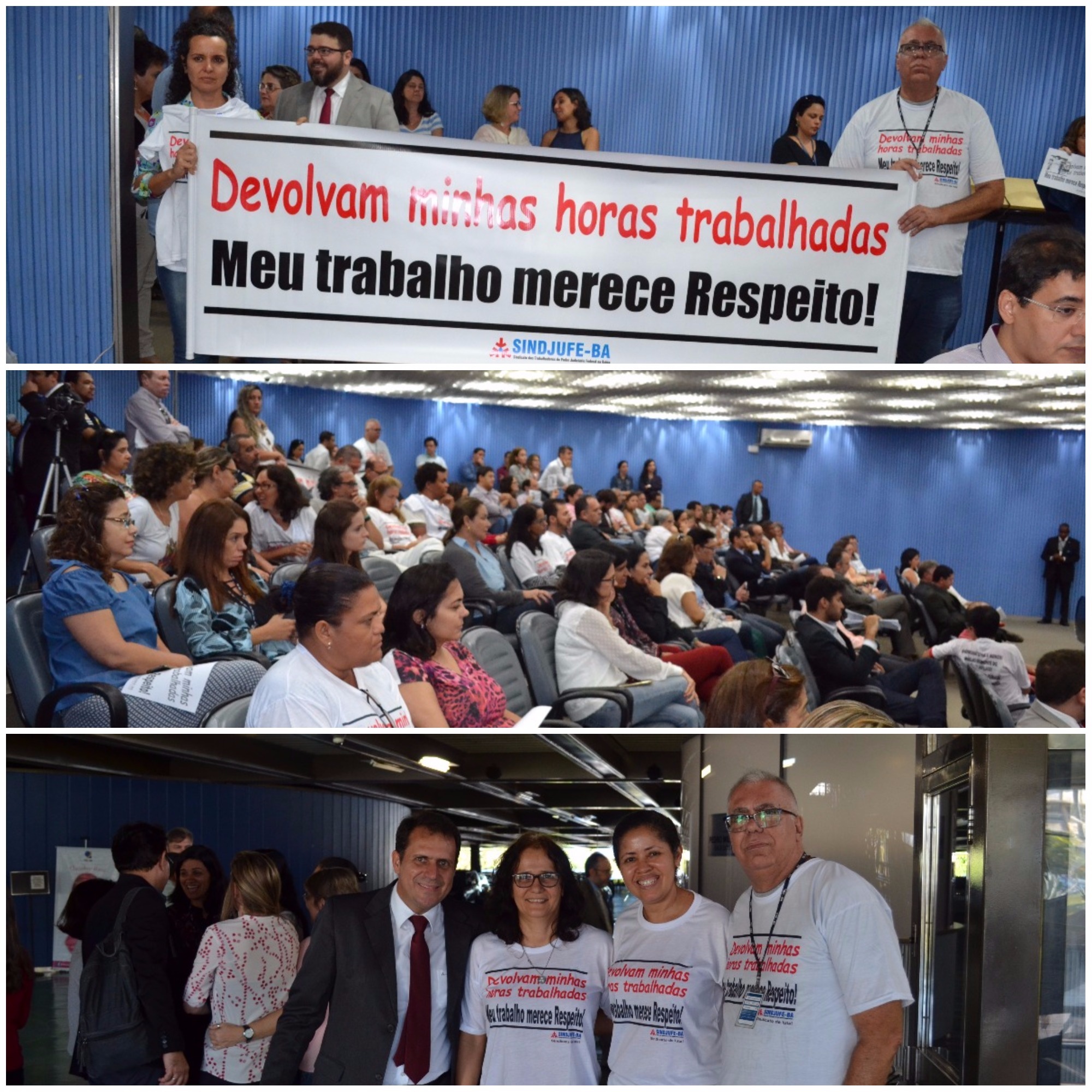 Ao longo dos últimos meses, o SINDJUFE-BA – representado pela coordenadora Denise Carneiro – juntamente com os servidores da Comissão formada em assembleia para tratar deste assunto esteve à frente de uma grande mobilização, que incluiu algumas estratégias, como: passagem em salas, confecções de requerimentos, memoriais, camisas, cartazes, faixas, memorial, visita aos magistrados e o mais importante, a união com os servidores da capital e do interior.