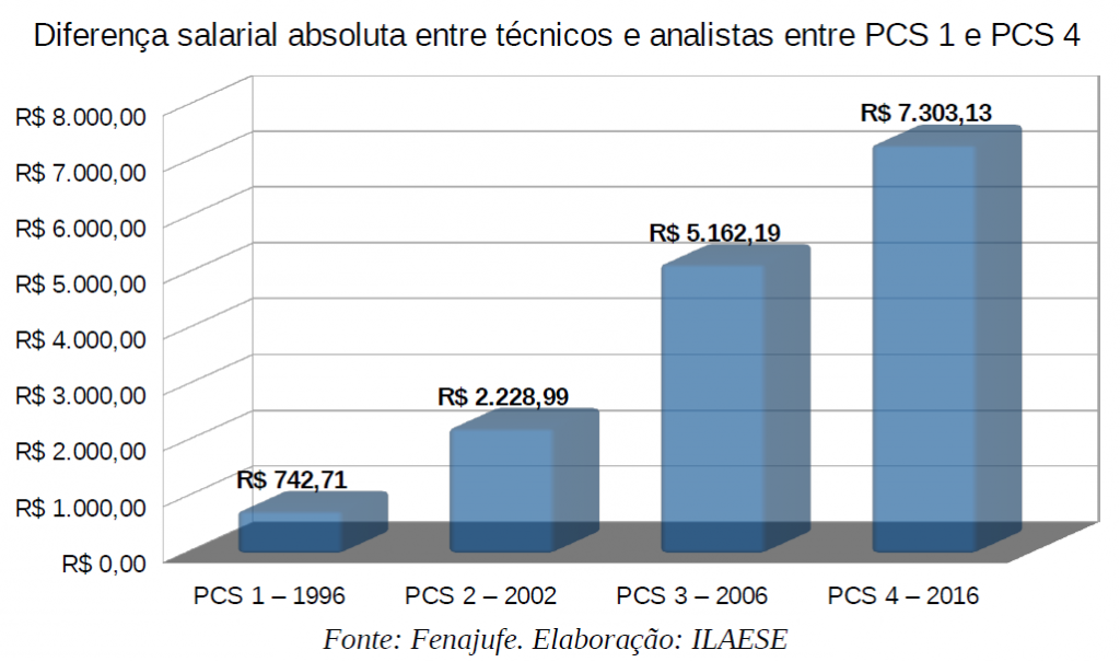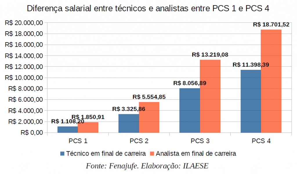 Ora, com cada uma dessas conhecidas PCS, se ampliou cada vez mais o abismo na remuneração entre técnicos e analistas, quer seja considerada no início, quer se considere no final das respectivas carreiras. Como podemos ver nos gráficos abaixo: