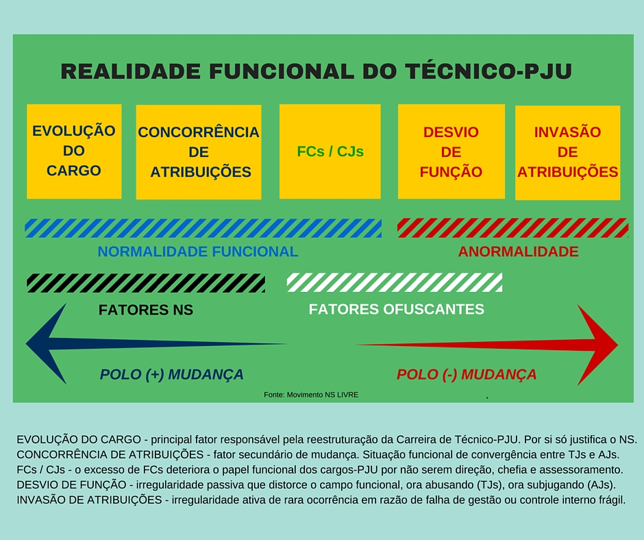 22. Assim, tem-se mais um motivo para a reestruturação da carreira de Técnico-PJU, vez que exerce além das suas atividades de suporte técnico e administrativo, outras mais em caráter comum ou concorrente com o cargo de Analista-PJU coexistem. Situação que consideramos normal, dito às linhas retro, haja vista o dinamismo que deve caracterizar as instituições que adotam a eficiência como princípio regente de suas atividades e funções precípuas.