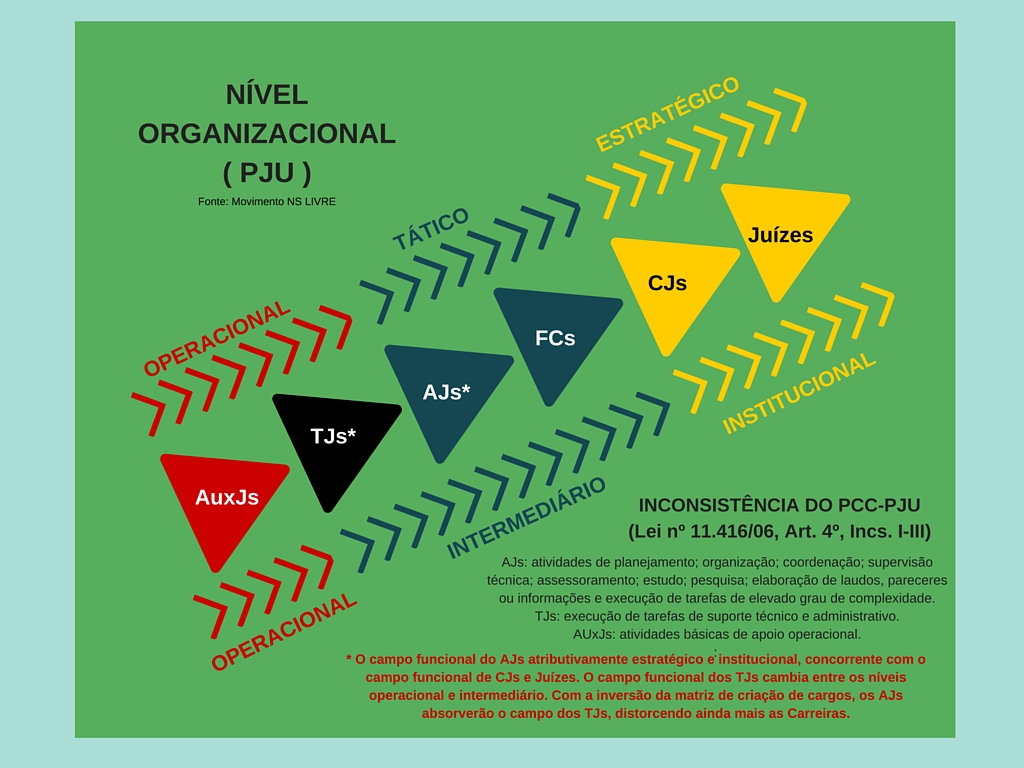 39. O Analista-PJU ocupa um campo funcional incoerente com o dimensionamento dado pela Lei a essa Carreira, que a alçou a um patamar mais estratégico, em concorrência com o patamar institucional, eis que a natureza executória é similar a esta, com exceção, é claro, daquelas de natureza de direção e chefia (CJs), eis que o cargo não comporta esse núcleo.