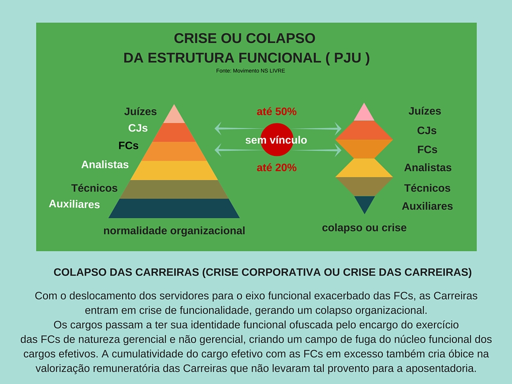 41. Esse cenário se agrava quando aportamos nos impactos previdenciários dessa aberração que acomete a cena organizacional em exame. As FCs não são incorporadas. A GAJ a qualquer momento pode deixar de sê-lo. Isso tem que mudar. As Carreiras do PJU entraram em verdadeiro colapso. Hoje não há identidade funcional. O Analista-PJU faz tudo. O Técnico-PJU faz tudo. Ninguém sabe mais quem é quem na cena organizacional.