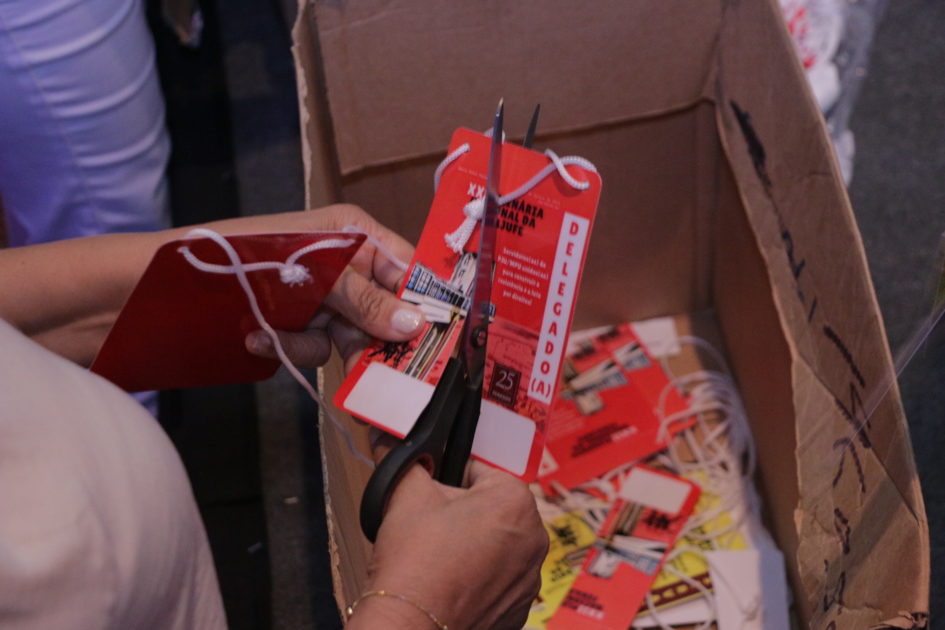 Antes do início dos trabalhos do dia, a Secretaria apresentou o resultado do credenciamento na plenária. Encerrado na sexta-feira, 3, no início da noite, os números contabilizaram, ao todo, 215 participantes. Deste total, 156 são delegados(as) e 46 observadores(as). A sobre dos crachás foram destruídos na presença da mesa diretora. O trabalho foi executado pelas funcionárias Patrícia Tavares (Fenajufe), Roseli Rodrigues (Sindjufe/BA) e Lúcia Dórea (Sindjufe/BA), sob supervisão da secretária política da Fenajufe, Eliane Mendes.