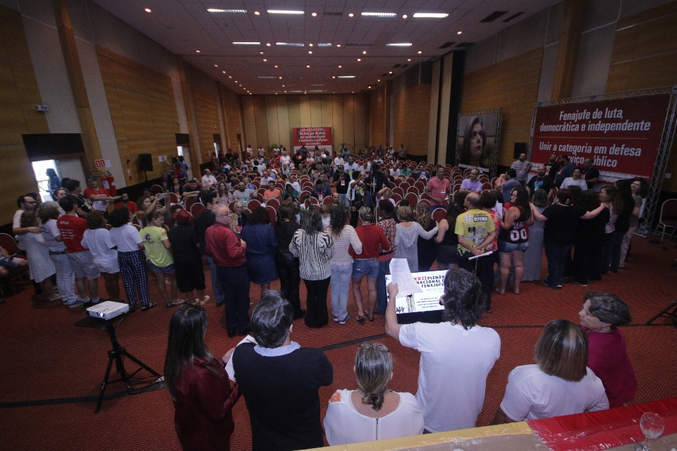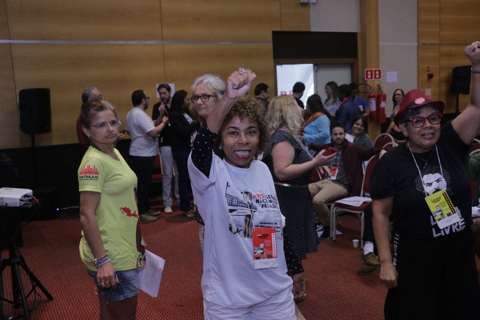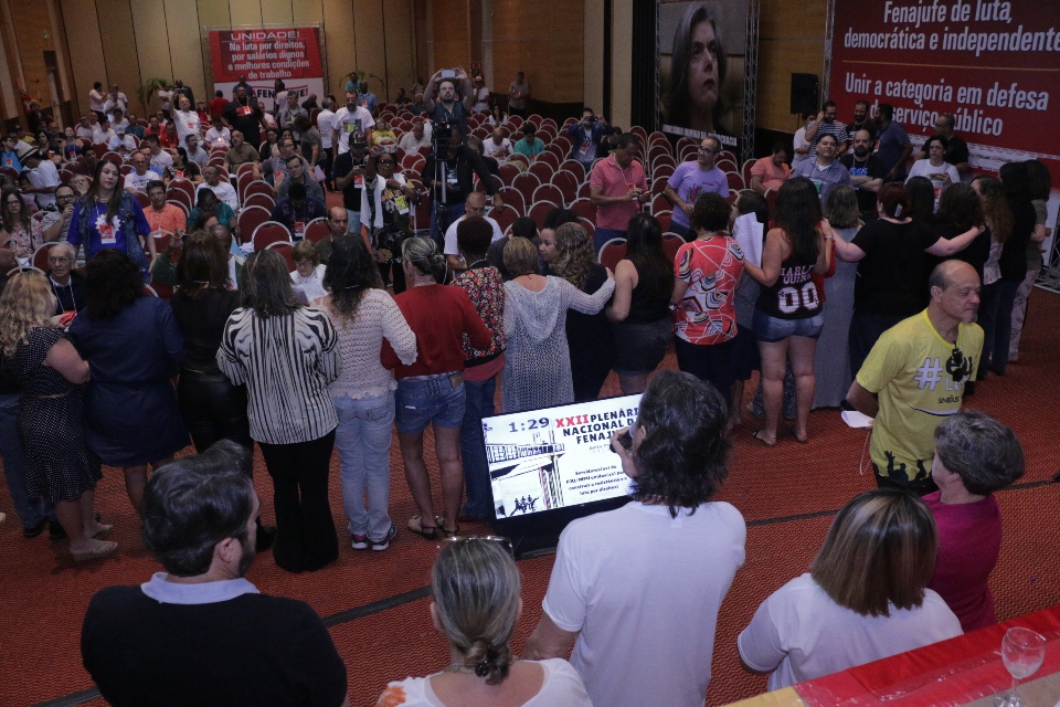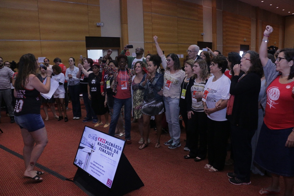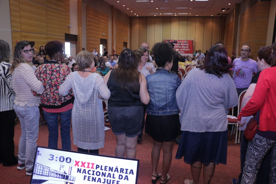 Neste momento, na Plenária Nacional da Fenajufe, em Salvador, delegadas e observadoras entram em resistência a um destaque de um delegado que pede a retirada, das discussões, de pautas que não sejam específicas, como a defesa das políticas de igualdade de gênero, defesa das mulheres, LGBTQIs, negros e outras defesas de caráter social. A mobilização das mulheres recebeu apoio de delegados e observadores. O risco de lutas isoladas foi tema abordado pelos palestrantes que, em diversos momentos, alertaram que posturas como esta comprometem os resultados buscados.