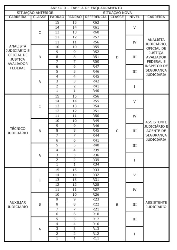Art. 80. Os servidores ocupantes do cargo de Analista Judiciário – área judiciária, cujas atribuições estejam relacionadas com a execução de mandados e atos processuais de natureza externa, na forma estabelecida pela legislação processual civil, penal, trabalhista e demais leis especiais, serão enquadrados no cargo de Oficial de Justiça Avaliador Federal seguindo como parâmetro o mesmo enquadramento indicado para o Cargo de Analista Judiciário.