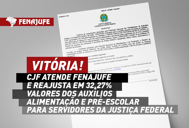 Em mais uma atuação vitoriosa da Fenajufe, o Conselho da Justiça Federal (CJF) reajustou em 32,27% os valores do auxílio-alimentação e também o valor do auxílio pré-escolar. A resposta ao ofício encaminhado pela Fenajufe ao CJF foi dada nesta terça-feira (16).
