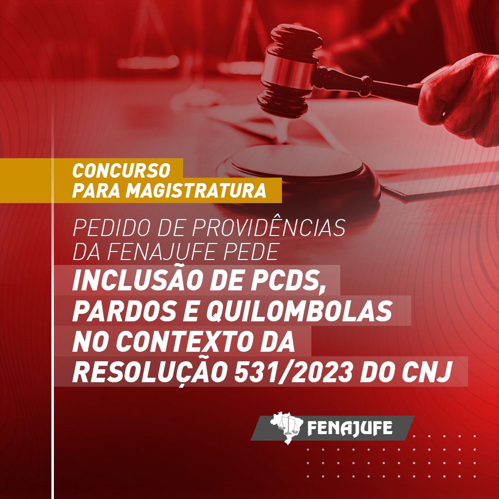 A Fenajufe protocolou Pedido de Providências (PP) junto ao Conselho Nacional de Justiça nesta terça-feira (23) solicitando que pessoas com deficiência (PCDs), pardas e quilombolas sejam incluídas no contexto do artigo 4º-A da Resolução CNJ 75/2009, dispositivo recentemente inserido com as alterações promovidas pela Resolução CNJ 531/2023.
