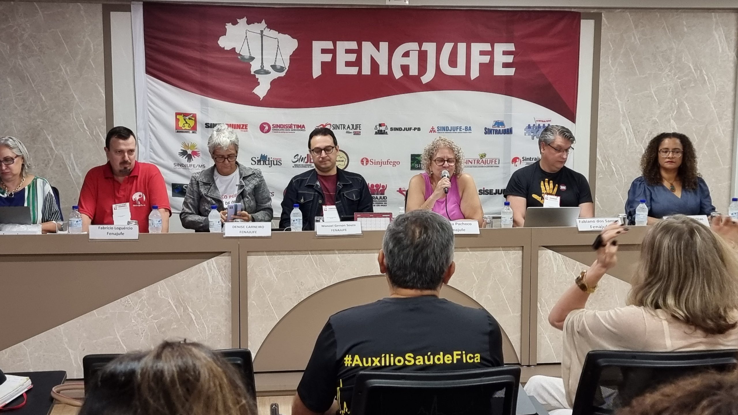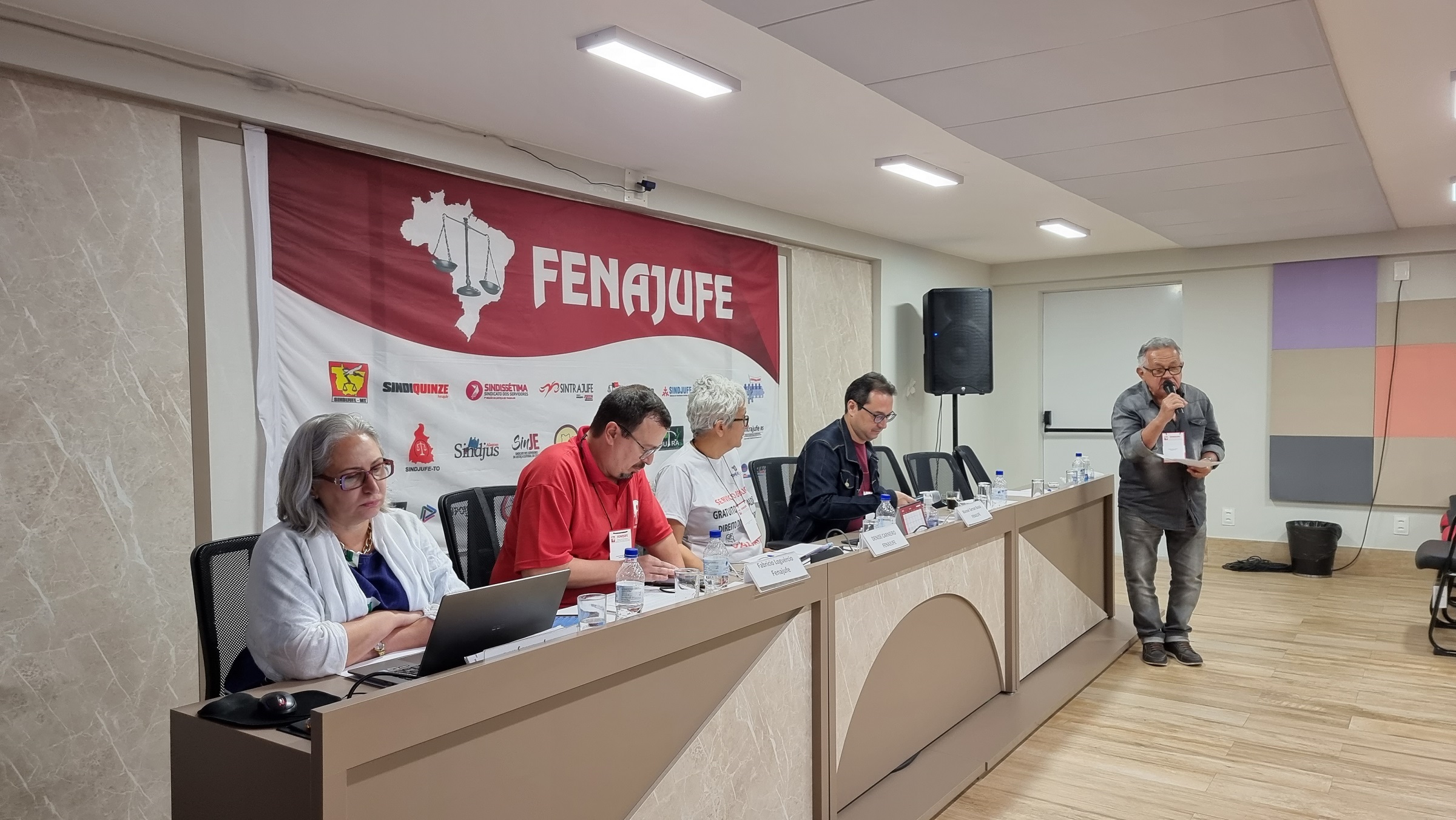 Além dos coordenadores que compõem a pasta de Organização Sindical e Políticas Institucionais Denise Carneiro, Manoel Gérson e Fabrício Loguercio, compuseram a mesa as coordenadoras Lucena Pacheco e Sandra Dias e o coordenador Fabiano dos Santos. Os diretores destacaram a importância da representação dos sindicatos de base no debate, articulação e deliberação em torno da política e principais pautas da categoria, como o NS, não absorção dos quintos, reestruturação da carreira, arcabouço fiscal, entre outros.