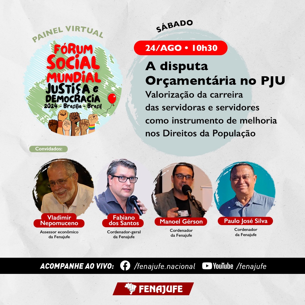 Para o dia 24 10:30h, no eixo “Capitalismo e Desigualdades”, o debate será com o tema: “A Disputa orçamentária no PJU – valorização das carreiras das servidoras e servidores como instrumento de melhoria nos direitos da população”. Serão debatedores os coordenadores Fabiano dos Santos, Manoel Gérson, Paulo José Silva e o consultor legislativo e assessor econômico da Fenajufe, Vladimir Nepomuceno.