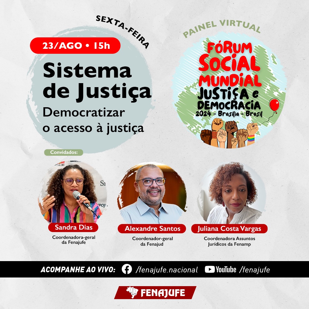 A Fenajufe vai participar da 2ª edição do Fórum Social Mundial Justiça e Democracia com atividades autogestionadas nos próximos dias 23 e 24. A participação será em duas lives. A que será realizada no dia 23 é em parceria com a Federação Nacional dos Trabalhados do Judiciário nos estados (Fenajud) e a Federação Nacional dos Trabalhadores dos Ministérios Públicos Estaduais (Fenamp).
