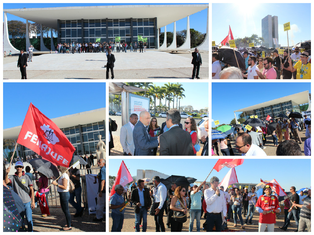 Servidores do Judiciário federal protestaram hoje na Praça dos Três Poderes, em frente ao Supremo Tribunal Federal, pela derrubada do veto ao PLC 28/2015. O projeto repõe perdas salariais da categoria, há quase dez anos com salários congelados.
