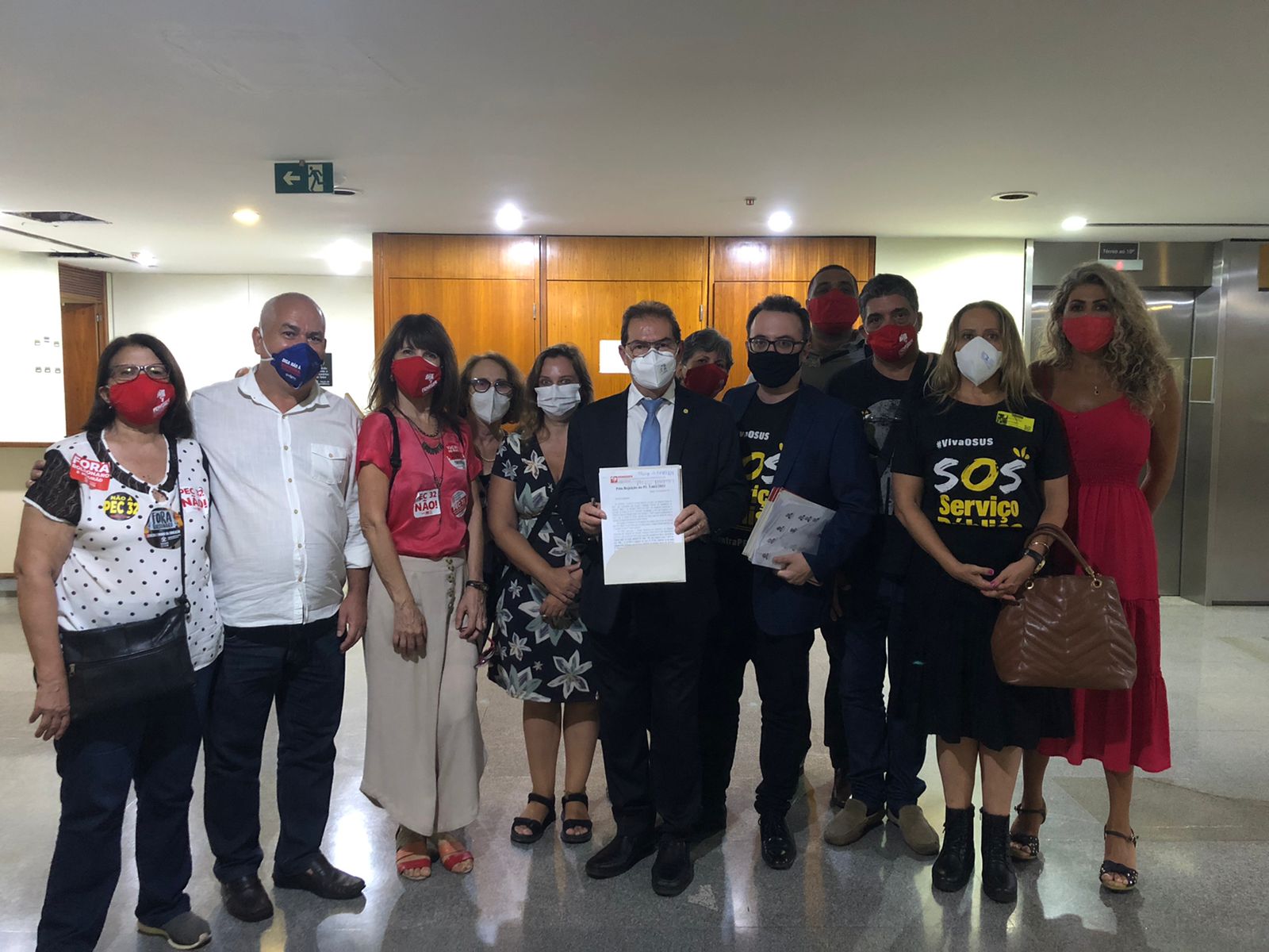 Acompanhados por servidoras e servidores da base e representantes de entidades do Judiciário Federal e dos Estados, os dirigentes também entregaram ao parlamentar o posicionamento da Fenajufe contra a proposta.