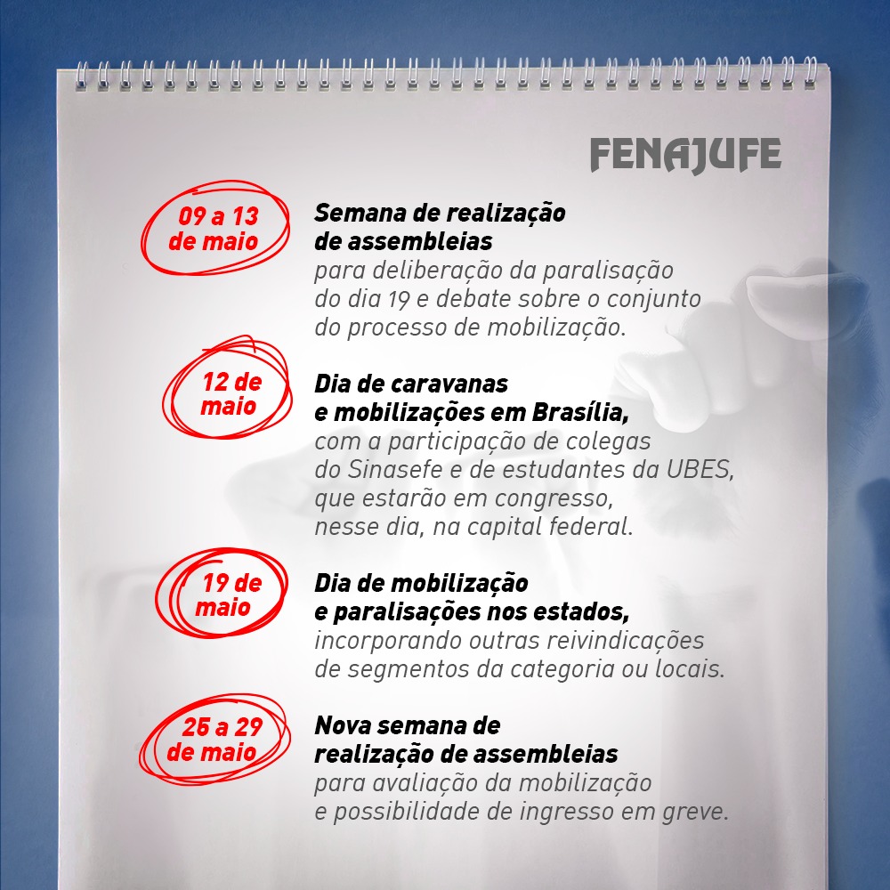 09 a 13 de maio: semana de realização de assembleias para deliberação da paralisação do dia 19 e debate sobre o conjunto do processo de mobilização;