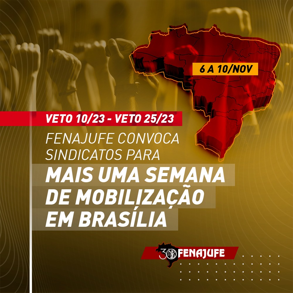 6 a 10/11 – envio de representantes (quantos puderem enviar) dos sindicatos para Brasília, período previsto para votação dos vetos 10 e 25/2023, com plantão ampliado da direção da Fenajufe, para dar continuidade ao trabalho de pressão e de convencimento das (os) parlamentares.