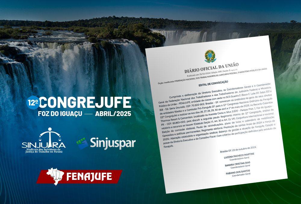 Foi publicada no Diário Oficial da União (DOU), nesta sexta-feira (25), a convocatória para o 12º Congresso Nacional da Fenajufe – Congrejufe –, instância máxima da Federação, que ocorrerá em Foz do Iguaçu (PR), entre os dias 26 de abril e 1º de maio de 2025. O evento terá como entidades anfitriãs o Sinjutra e o Sinjuspar, sindicatos da base da Fenajufe no Paraná. O estado foi escolhido para sediar o maior evento da categoria na XXIV Plenária Nacional, em Natal (RN), no mês de maio.