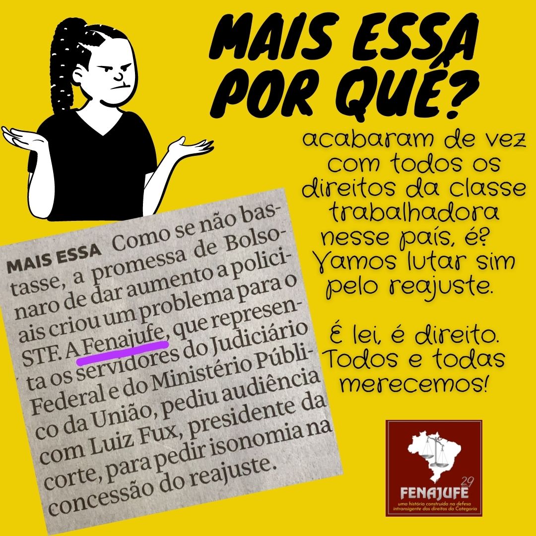 Jornais como a Folha de São Paulo e Valor Econômico citaram a mobilização do conjunto da categoria do Judiciário Federal através da Fenajufe, ao solicitar que o ministro Luiz Fux, presidente do STF e do CNJ, assuma posição em defesa de toda o funcionalismo. O movimento é clara oposição ao que tenta fazer Jair Bolsonaro e o Congresso Nacional, de privilegiarem apenas algumas poucas categorias, em detrimento da grande maioria das carreiras do Serviço Público.