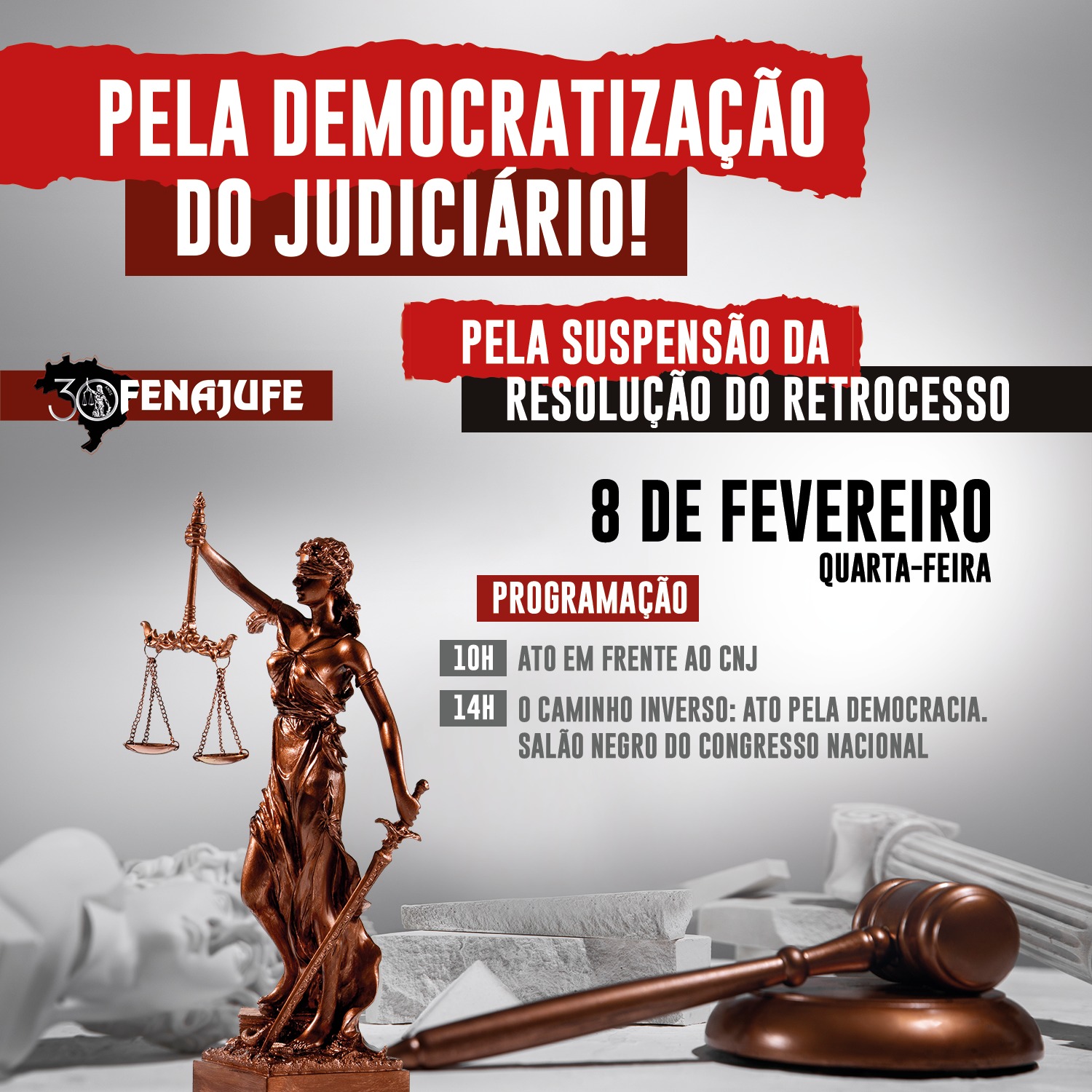 O ato contará com a participação de representantes Federação Nacional dos Trabalhadores do Judiciário Federal e Ministério Público da União (Fenajufe); da Federação Nacional dos Trabalhadores do Judiciário nos Estados (Fenajud) e Federação Nacional dos Servidores dos Ministérios Públicos Estaduais (Fenamp) além da Associação dos Servidores da Justiça do DF(Assejus) e da Associação dos Servidores da Justiça Brasileira (ASJB).