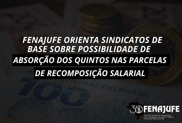 A Fenajufe encaminhou nesta semana orientação aos Sindicatos de base para que oficiem os órgãos do Judiciário Federal e Ministério Público dos estados, solicitando que não seja aplicada a decisão do Supremo Tribunal Federal (STF) pela absorção dos quintos nas parcelas de recomposição salarial parcial. O presidente Luiz Inácio Lula da Silva (PT) sancionou sem vetos, na terça-feira (10), as Leis nº 14.523 e 14.524 de 2023 — que tratam dos projetos de recomposição salarial das servidoras e servidores do PJU e MPU, PLs 2441 e 2442/22.