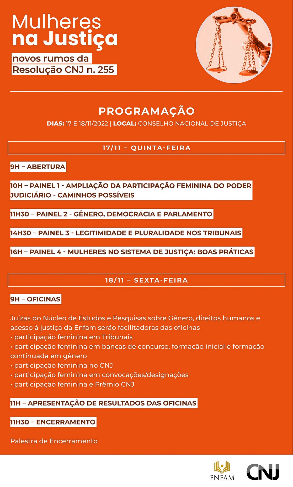 O evento Mulheres na Justiça: Novos Rumos da Resolução CNJ n. 255 acontece nesta quinta-feira (17) e sexta-feira (18)