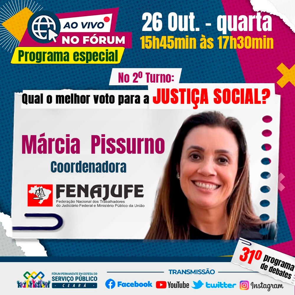 A coordenadora Márcia Pissurno vai representar a Fenajufe em debate organizado pelo Fórum Cearense de Defesa do Serviço Público. Atividade será transmitida ao vivo pelas redes sociais do Fórum de forma simultânea.