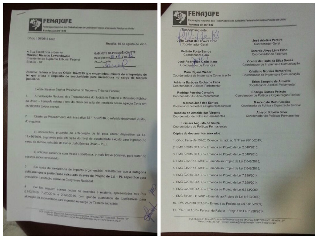 Para agilizar o cumprimento às medidas constantes do pacote pró NS, a Fenajufe, através dos coordenadores Júlio Brito e Costa Neto, protocolou na tarde da quinta-feira (18/8) no STF o Ofício 156/2016, o qual foi recebido pela Secretaria Processual do Gabinete da Presidência na pessoa de Daniel Vergueiro.