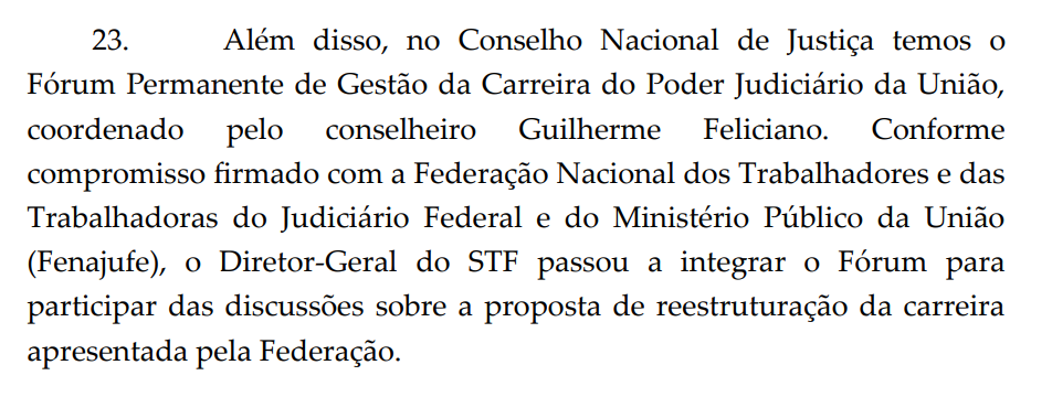 O DG sugeriu que o Fórum de Carreira do CNJ encaminhe a revisão anual dos salários dos(as) servidores(as) do PJU, como proposta legal, e que inclusive, seja uma proposta de maneira legal, como encaminhamento do fórum. A Fenajufe vai encampar a sugestão e trabalhará em defesa da revisão. E que além disso, o presidente do STF e do CNJ, ministro Luís Roberto Barroso, firmou um compromisso com os servidores ao designar o diretor-geral para representar o STF na discussão da reestruturação da carreira, no Fórum de Carreira do CNJ. O ministro, inclusive, mencionou a Fenajufe ao votar a proposta orçamentária para o exercício de 2025, demonstrando compromisso quanto à reestruturação da carreira do PJU.
