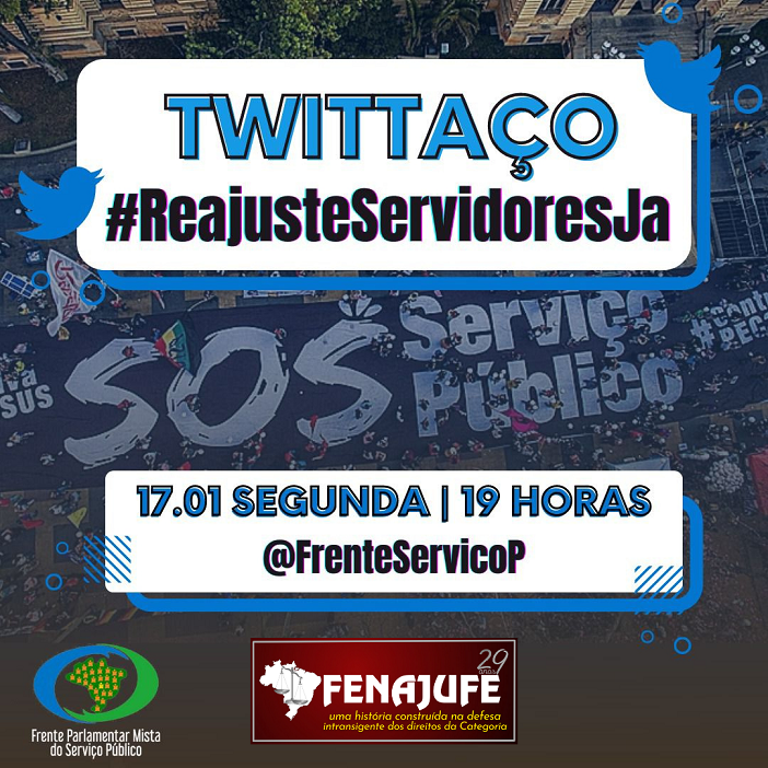 A Frente Parlamentar Mista do Serviço Público realiza nesta segunda-feira (17) o primeiro tuitaço de 2022 com foco na recomposição salarial das servidoras e servidores públicos. A mobilização no Twitter conta com apoio da Fenajufe e diversas entidades parceiras. Utilize a hashtag #ReajusteServidoresJa.