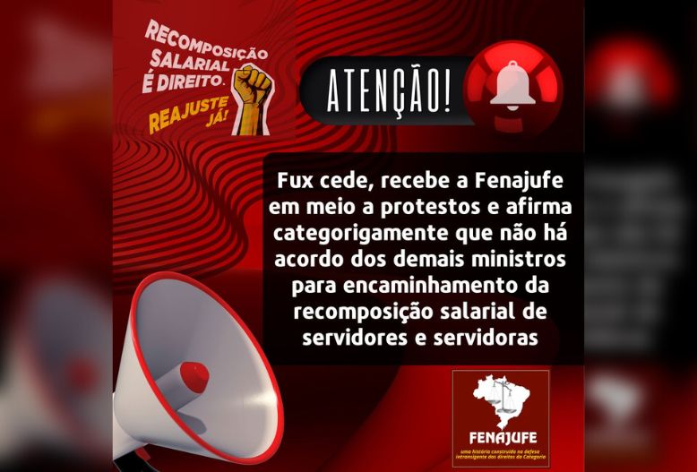 E para quem ainda tem dúvidas sobre o poder da mobilização e o impacto dos atos, assista ao momento em que Fux, nitidamente incomodado – e rouco – avisa que está “usando um tom de voz mais alto por conta das vuvuzelas”. Elas, as vuvuzelas, mais uma vez, são as grandes aliadas da luta das servidoras e servidores. As imagens são da TV Justiça e a publicação, um extrato do Migalhas: