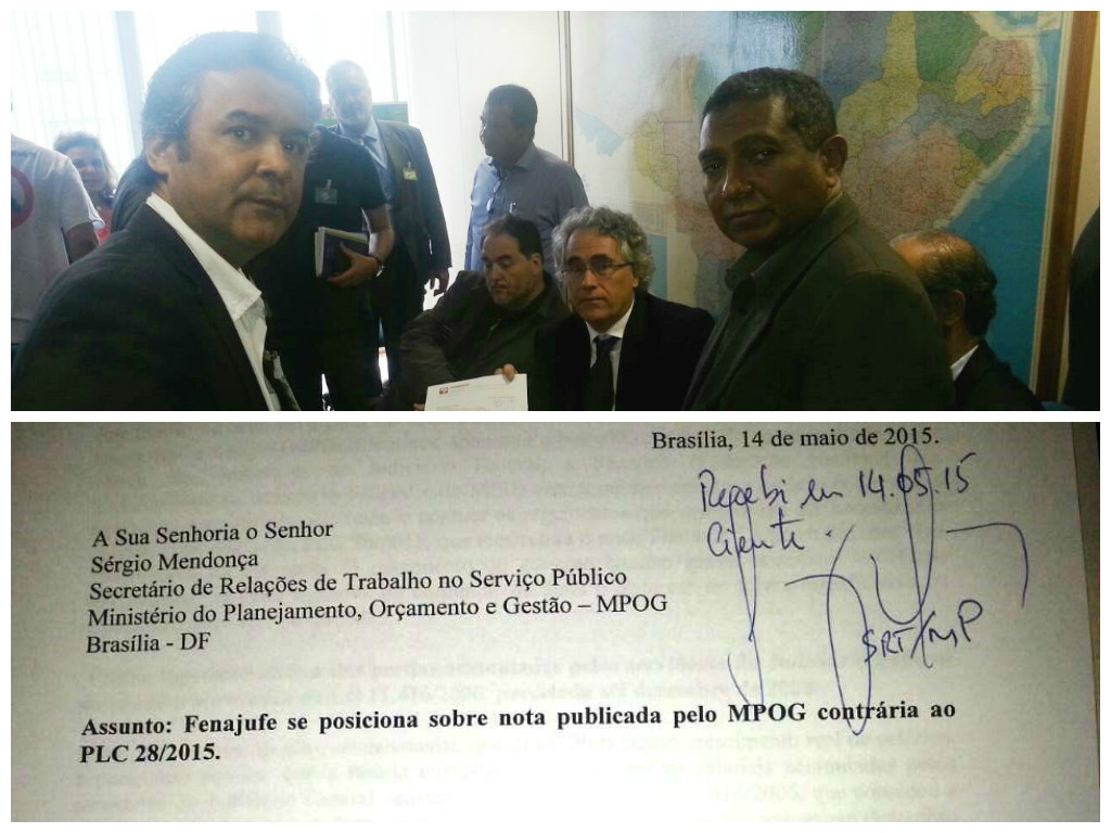 Ao fim da reunião os representantes das Fenajufe protocolaram junto ao secretário Sérgio Mendonça, ofício encaminhando a nota da Federação que responde as mentiras publicadas na terça-feira, pelo MPOG, que atacam o PLC 28/2015.