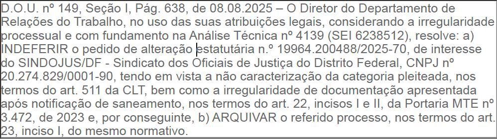 Com essa publicação, o Ministério do Trabalho reafirma a ilegitimidade do Sindojus/DF na tentativa de obter registro nacional. A decisão determinou, ainda, o arquivamento do processo administrativo do sindicato, nos termos do artigo 511 da Consolidação das Leis do Trabalho (CLT).