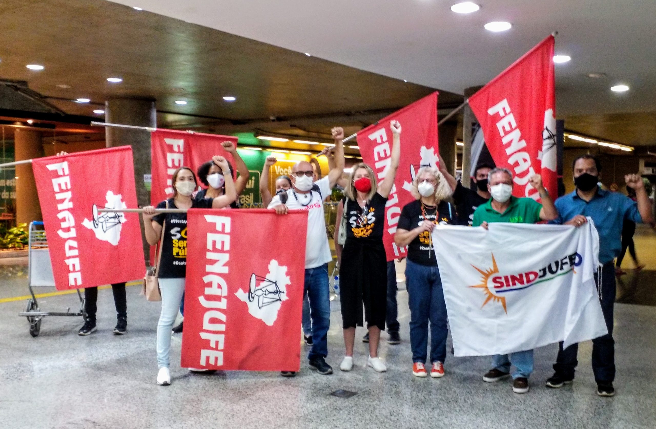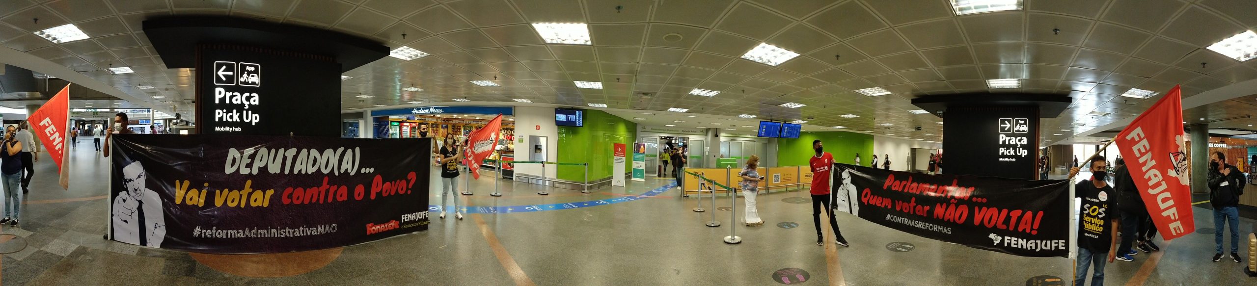Servidores Públicos das três esferas de governo da República promoveram mais um dia de pressão, na recepção a parlamentares no aeroporto internacional de Brasília. Presença determinante da Fenajufe sindicatos filiados. A Federação esteve representada pela coordenadora Lucena Pacheco Martins e pelo coordenador Evilásio Dantas.