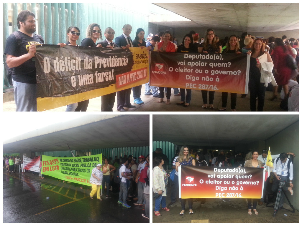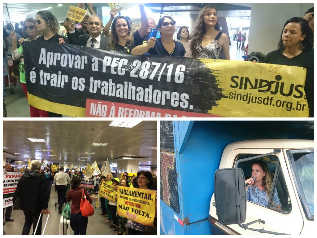 Já na terça-feira (28), as primeiras ações foram desenvolvidas no Aeroporto Internacional de Brasília, quando os SPFs recepcionaram – e pressionaram muito – parlamentares que chegavam à capital da República. Concentrados no portão de desembarque doméstico, os manifestantes cobraram mais uma vez a derrubada das reformas e entoaram cantos e palavras de ordem com uma mensagem simples a deputados e senadores: quem votar sim às reformas, não volta (reeleito) para o Congresso Nacional.