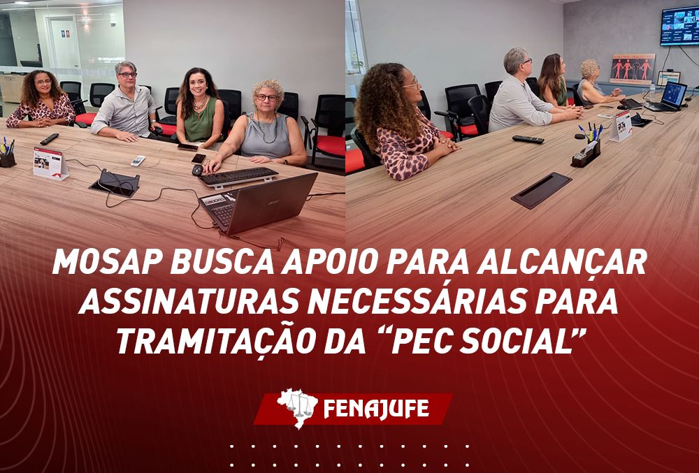 A Fenajufe participou, nesta terça-feira (6), de mais uma reunião importante do Movimento dos Servidores Aposentados e Pensionistas (Mosap); o objetivo foi delinear estratégias para a coleta das assinaturas necessárias para que a chamada “PEC Social”, substitutivo apresentado pelo deputado Cleber Verde (MDB-MA), possa tramitar no Congresso Nacional. São necessárias 171 assinaturas.
