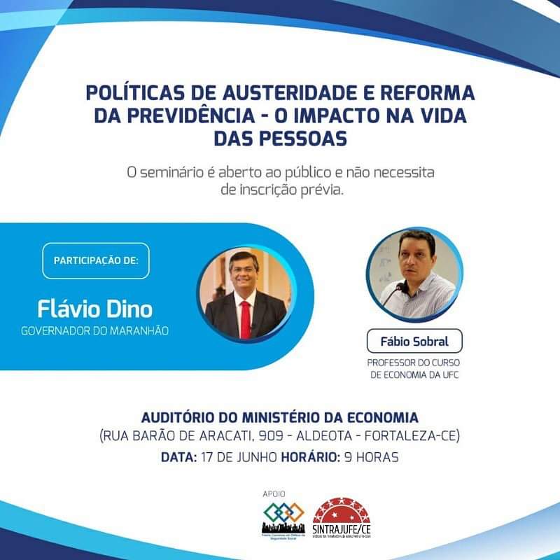 Os coordenadores da Fenajufe, Engelberg Belém Pontes e Roniel Andrade, participaram nesta segunda-feira, 17, do seminário Políticas de Austeridade e Reforma da Previdência – o impacto na vida das pessoas. O evento aconteceu no auditório da Receita Federal, em Fortaleza, capital do Ceará e teve como palestrantes o governador do Maranhão, Flávio Dino (PC do B) e do economista Flávio Sobra, professor da Faculdade de Economia da Universidade Federal do Ceará.