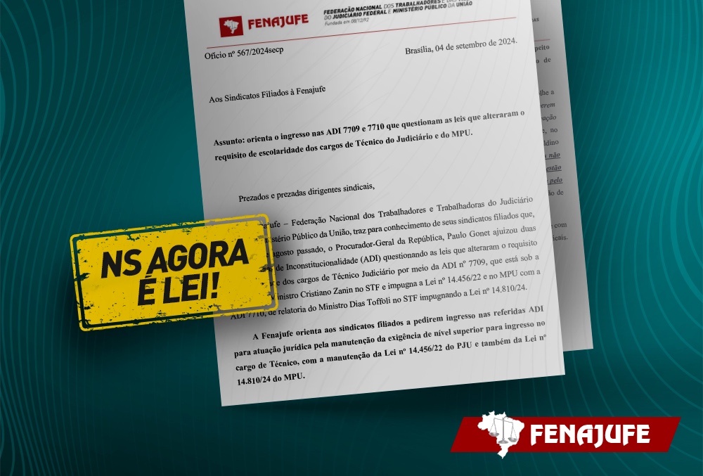 A Fenajufe orientou, nessa quarta-feira (4), que os sindicatos de base ingressem nas duas Ações Diretas de Inconstitucionalidade (ADIs) – 7709 e 7710 – ajuizadas no Supremo Tribunal Federal (STF) pelo procurador-geral da República, Paulo Gonet, questionando o nível superior (NS) para os técnicos do PJU e MPU. O objetivo é fortalecer a atuação jurídica em defesa do NS nas Leis 14.456/22 e 14.591/2023.