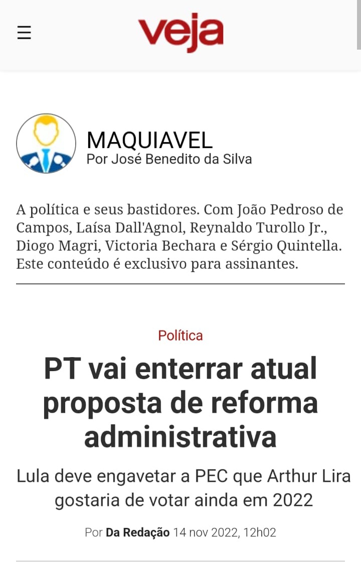 De acordo com reportagem publicada na coluna Maquiavel da VEJA, o presidente eleito Luiz Inácio Lula da Silva (PT) “vai enterrar a reforma administrativa”. Segundo a matéria, Lula “se articula para cumprir a promessa de engavetar a PEC 32/2020, que propõe a reforma administrativa e é alvo de críticas de servidores públicos”.