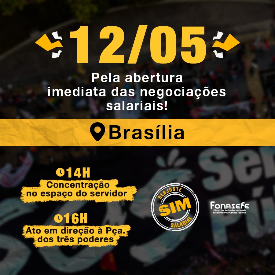 12 de maio: Ato  a partir das 14 horas em Brasília:, com passeata as 16 horas em conjunto com servidores do Sindicato Nacional dos Servidores Federais da Educação Básica, Profissionais e Tecnológica (Sinasefe) e de estudantes da União Brasileira dos Estudantes Secundaristas (UBES)que estarão em congresso nesse dia em Brasília;