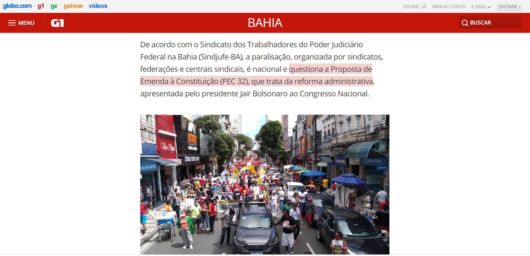 Matéria publicada no G1 Bahia destaca protesto de servidores(as) federais contra a PEC 32/20